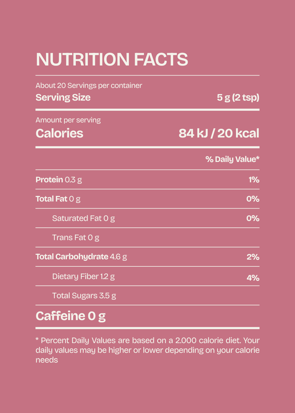 Finely milled from vibrant pink pitaya, this naturally caffeine-free superfood is rich in antioxidants, vitamins, and fiber. Its bright color and gentle fruity taste make it a versatile ingredient for lattes, smoothies, and healthy desserts.